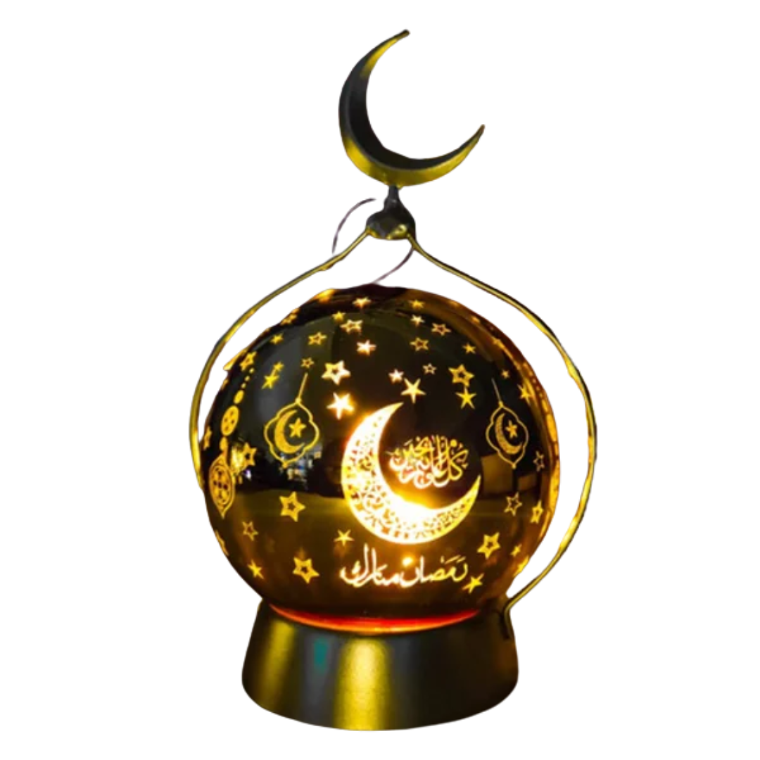 اباجورة رمضان تضيف لمسة رمضانية ساحرة للمنزل أو المكتب مع إضاءة LED دافئة تعرض نقوش الهلال والنجوم والمساجد مع تهنئة رمضان مبارك، تصميم آمن وخفيف الوزن يسهل وضعه على الطاولات لإضاءة جميلة وجو روحاني خلال الشهر الكريم.
