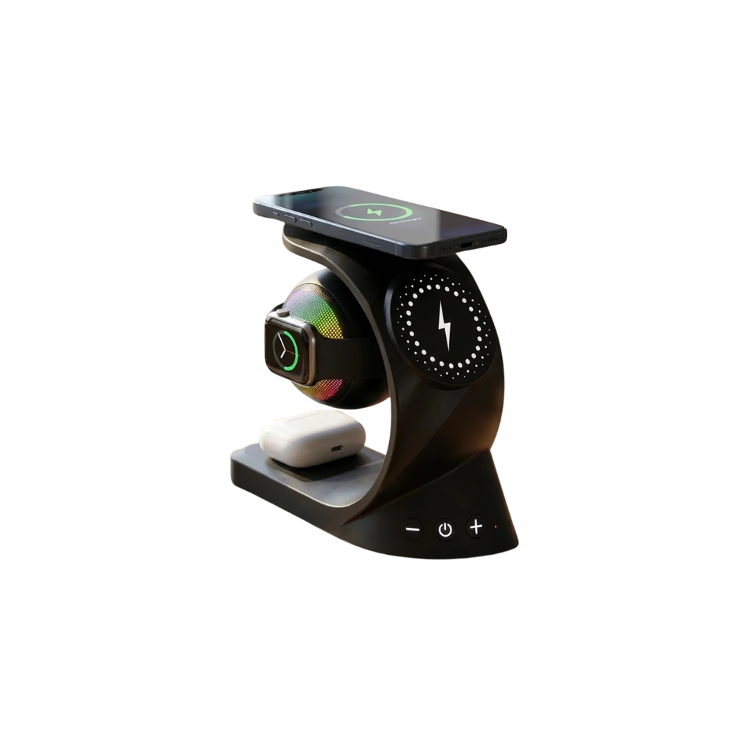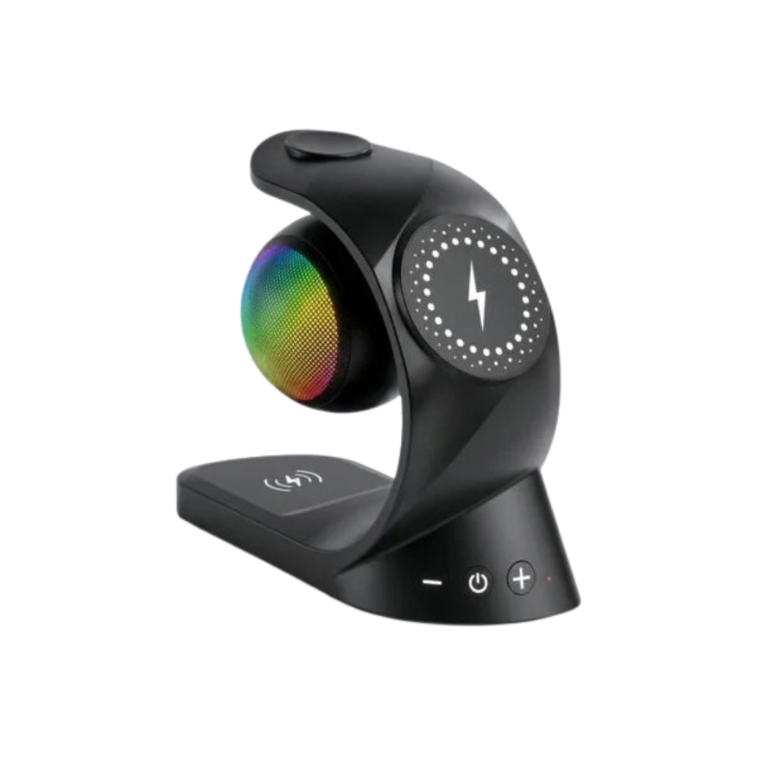 قاعدة شاحن لاسلكي T17 تجمع بين شحن الهاتف، الساعة، وسماعات الأذن لاسلكيًا بسرعة وكفاءة، مع تصميم أنيق وإضاءة RGB تضيف لمسة عصرية لمكتبك، وتوفر تنظيمًا عمليًا للأجهزة مع حماية ذكية من الحرارة والزيادة في التيار.